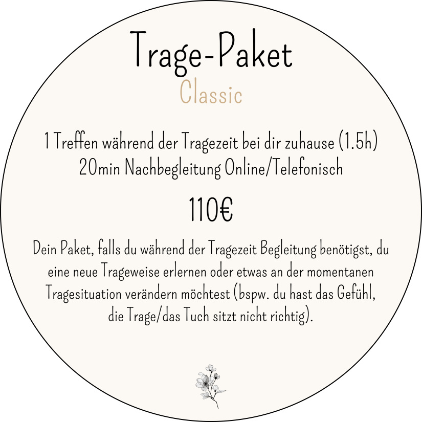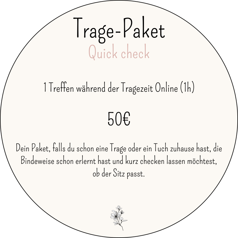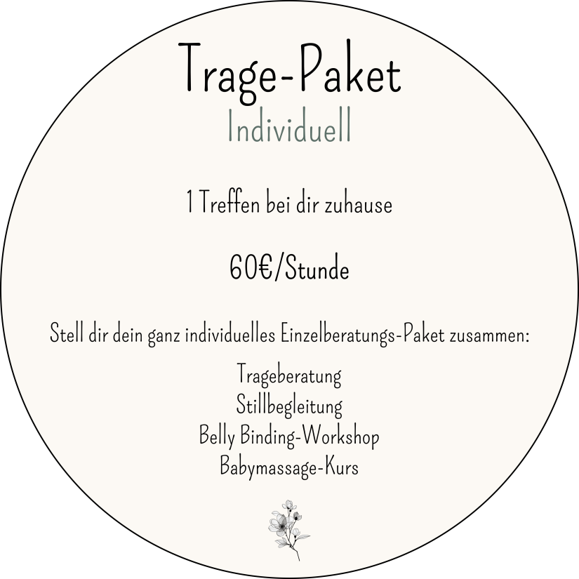 Falls du bereits einen kleinen Tragling zuhause hast oder bald haben wirst, komme ich gerne für eine Einzelberatung zu dir nach Hause oder wir treffen uns Online. Angepasst an eure Bedürfnisse sprechen wir über physiologisches und sicheres Tragen, Materialkunde sowie Trage- und Bindeweisen. Üblicherweise habe ich bei vor Ort-Terminen Tragehilfen/Tragetücher für dich zum Ausprobieren mit und zeige dir 1-2 ausgewählte Bindeweisen pro Beratung. Wenn du bereits ein Tragetuch/Tragehilfe zuhause hast, werfen wir gemeinsam einen Blick darauf und ich zeige dir, wie du sie richtig einstellst.