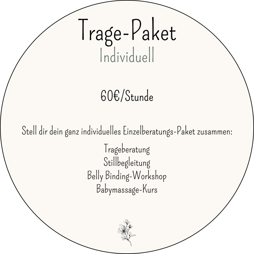 Angepasst an eure Bedürfnisse sprechen wir über physiologisches und sicheres Tragen, Materialkunde sowie Trage- und Bindeweisen. Üblicherweise habe ich bei vor Ort-Terminen ausgewählte Tragehilfen/Tragetücher für dich zum Ausprobieren mit und zeige dir 1-2 Bindeweisen pro Beratung. Wenn du bereits ein Tragetuch/Tragehilfe zuhause hast, werfen wir gemeinsam einen Blick darauf und ich zeige dir, wie du sie richtig einstellst.
